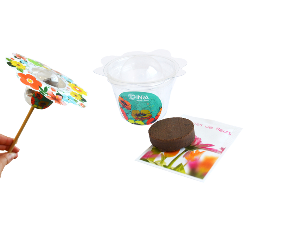Specialist in communication through nature, Idées Nature unveils this pretty floral stem (ref.IDG72). Highly visible and easy to use, this new planting kit is the ideal and original gift to offer at fairs and other events. The set contains a peat pad, a seed bag and a wooden rod (60 cm) to distribute. Personalization of the flower from 100 copies. Four-colour adhesive on the standard model.
