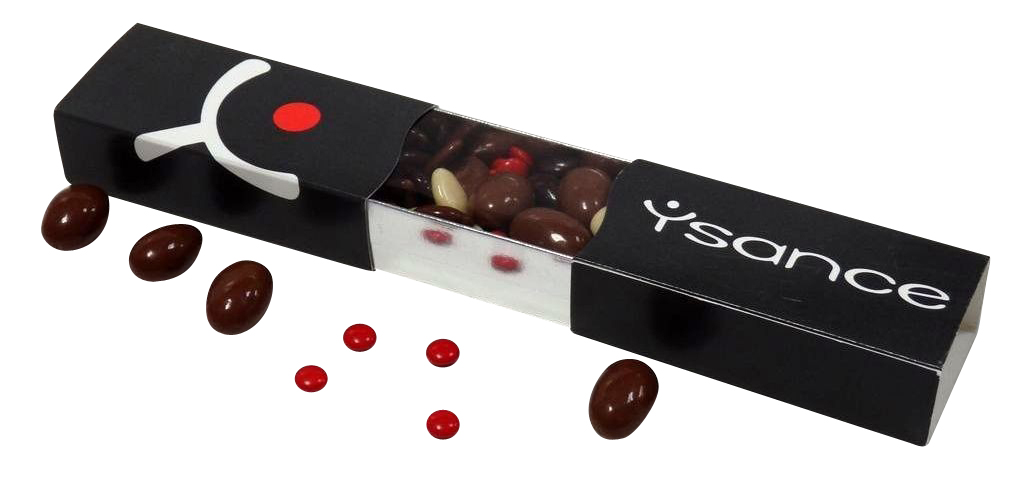 Filled with delicious chocolate dragees (your choice), Délice Pub‘s personalized “Wave” box is a great success. The bottom of the box (suitable for food contact) is made of white, gold or silver cardboard. The sheath, on the other hand, is made in two parts, with a wave-shaped cut in its centre. It is fully customizable, in four-colour process or, for a very elegant result, in hot transfer on coloured and/or textured creative paper. A transparent PVC cover protects the delicacies. Three sizes available: 13 cm (95 gr), 20.2 cm (150 gr) and 28 cm (250 gr).