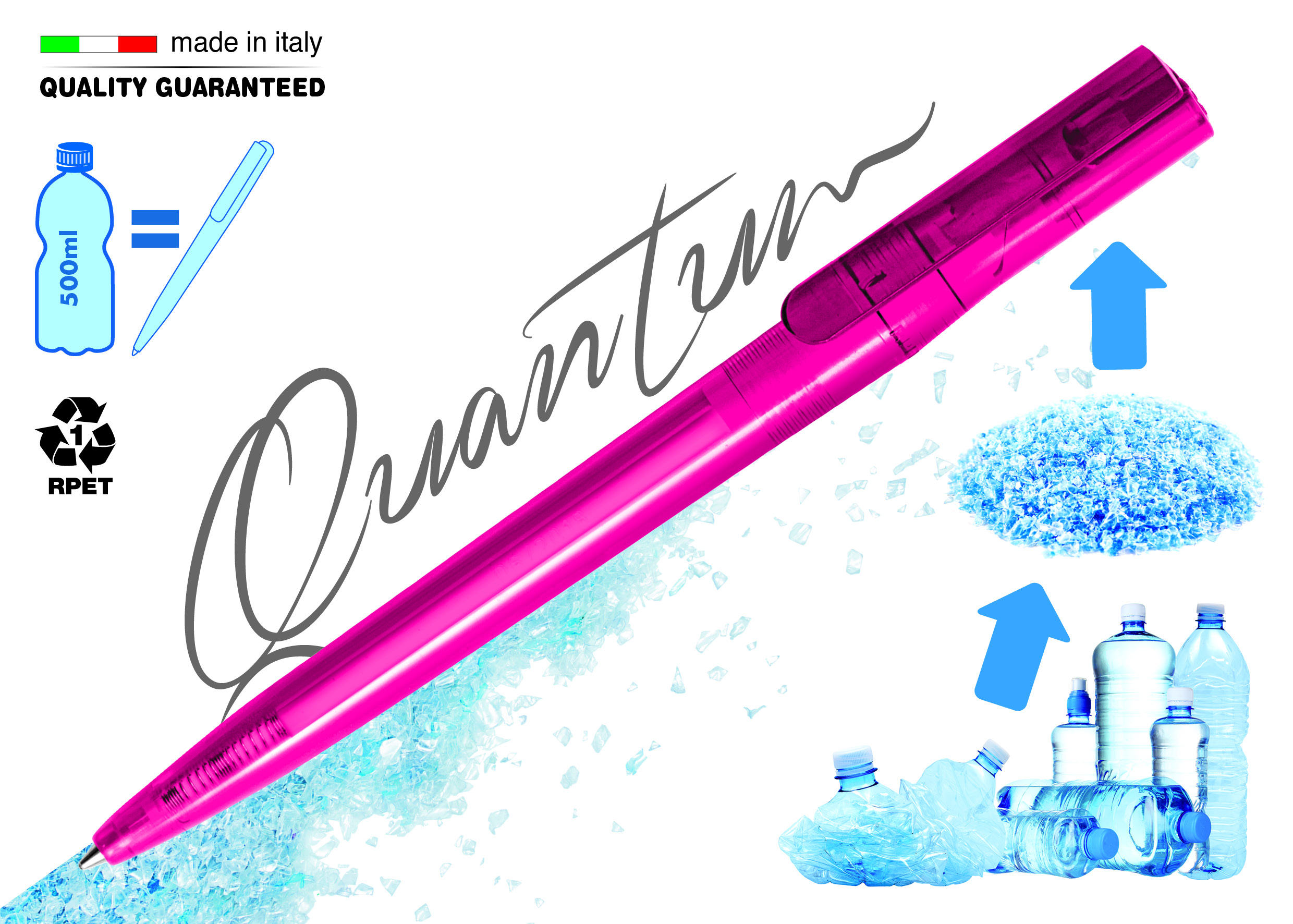 The Promoland presents “Quantum”, its new ballpoint pen made of recycled PET. Its manufacturing and production process is certified and patented, guaranteeing respect for the environment. It is available in several matte or translucent colours.