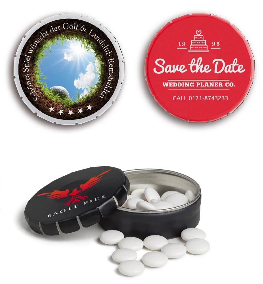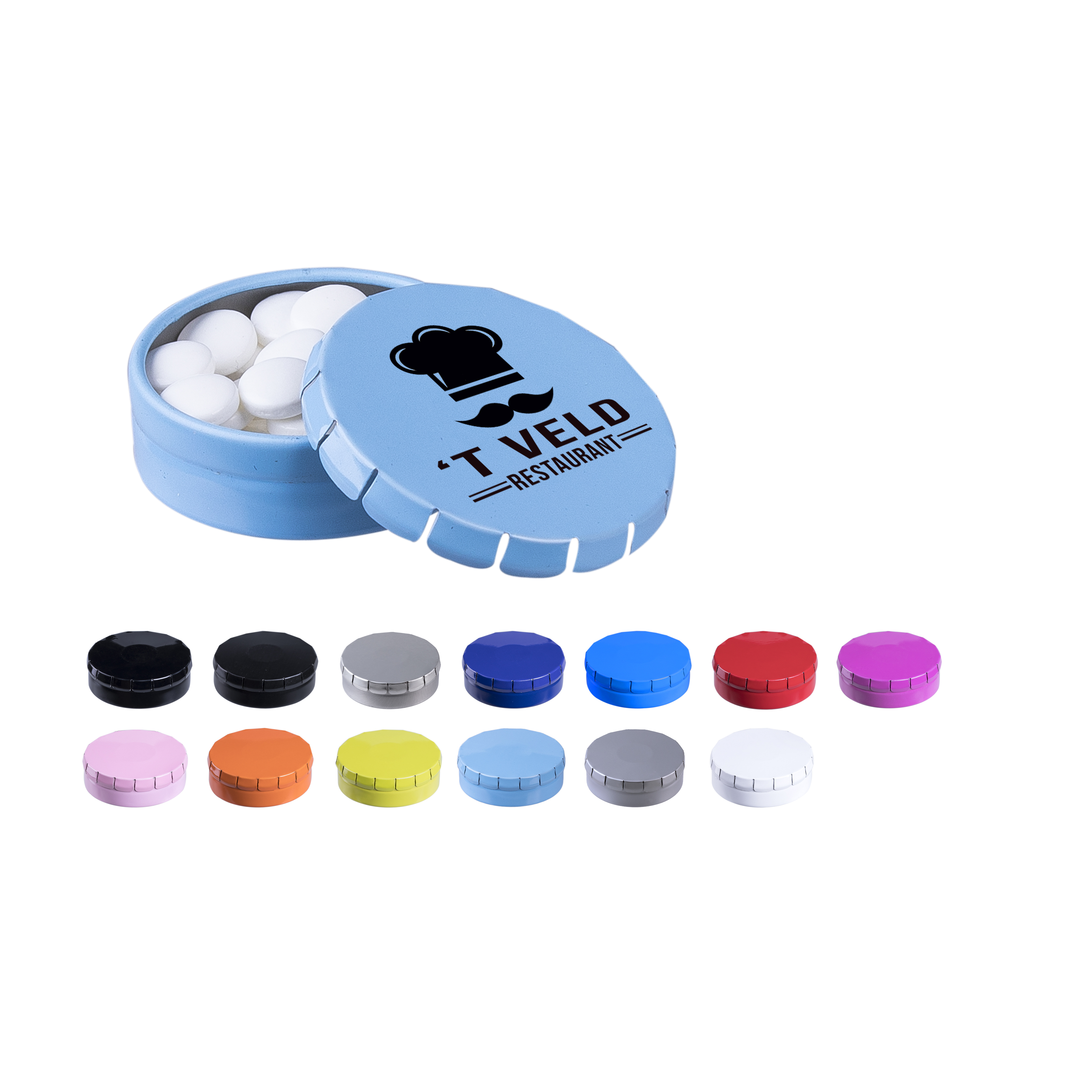 This Dutch-made mini click-clack box (47 x 15 mm) is available in 13 colors. Printed in four-color process up to the edge, it is filled with 12 g of sugar-free (and E171-free) mint candies, which can be consumed within three years. Orders starting from 144 pieces. Delivery within two weeks.
