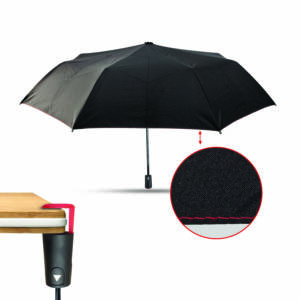 This latest addition to the Raintop family combines both elegance and ingenuity. Very dark gray, topped with a choice of blue, red or gray stitching. Its two-step opening system allows very easy manual closing. Its waterproof cover allows it to be stored immediately after use. In the handle hides a hook system allowing the umbrella to be fixed directly on a desk, on a restaurant table or on a train or plane shelf. Available in three colors. Personalization by screen printing, four-color transfer and doming. Weight: 357 g. Closed length: 29 cm. Diameter: 97 cm.