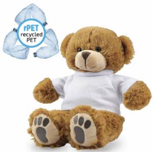 Axpol presents its teddy bear made of rPET (ref. HE783). This brown bear dressed in a white T-shirt can be personalized in his outfit. Suitable for printing, the T-shirt is packaged separately. It is also available in yellow, on request. This product is GRS (Global Recycled Standard) certified.