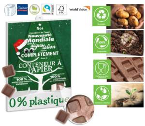 Kalfany Süße Werbung presents the Chocolate Eco Advent Calendar. Inside we find an extra-fine milk chocolate from Gubor, with fair trade cocoa. The preformed support is 100% compostable and recyclable. It is made from natural raw materials, such as potato starch, paper fibers, and water. Everything is packaged with customizable double-sided cardboard, FSC certified and recyclable. For each calendar ordered, Kalfany donates a cent to the benefit of the NGO World Vision for environmental projects. This advent calendar is available in the classic size 348 x 248 x 11 mm, or in the A5 format.